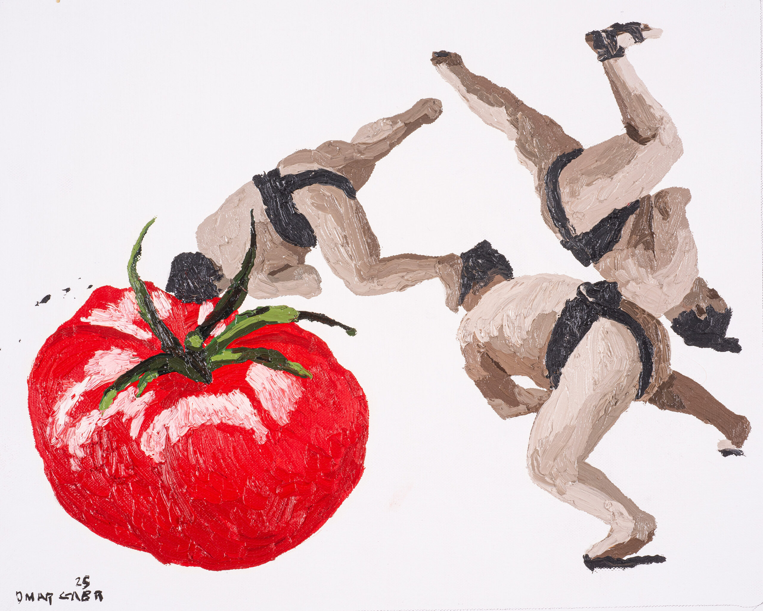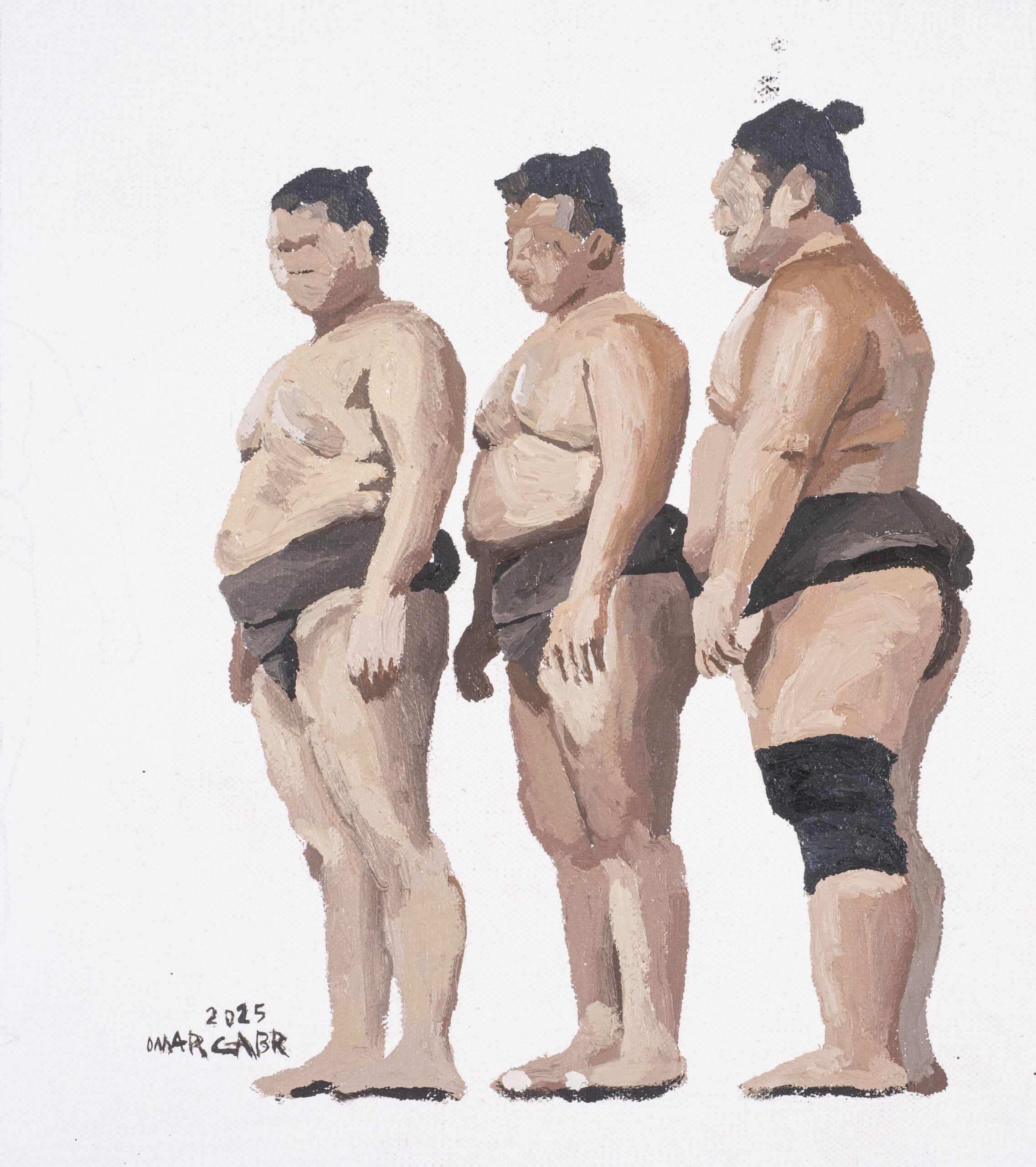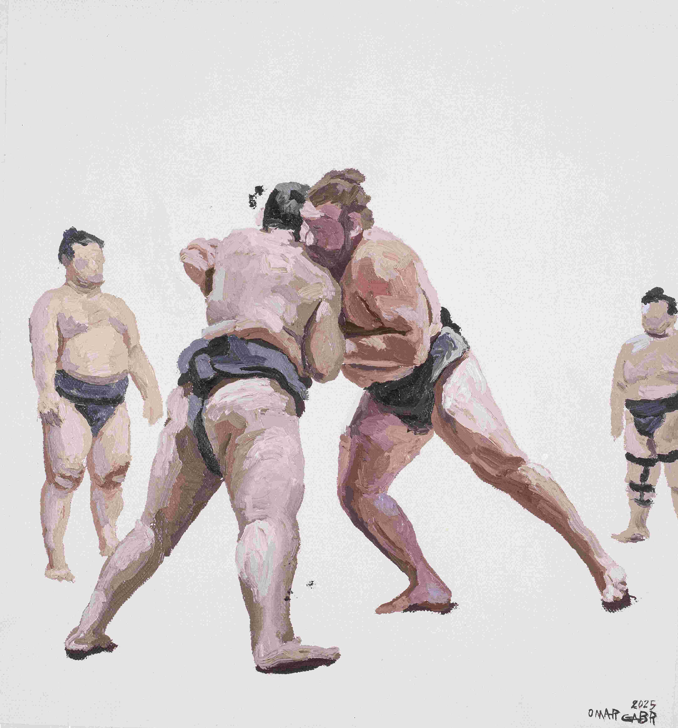 Omar Gabr is attuned to the society he grew up in and its consequences: post-revolution Egypt, the digital age of internet and social media. His figure and portrait-based work often explore personal struggles, institutional negligence as well as political and social commentary, with satire and whimsical brushstrokes. Filling canvases, papers and doors with figures, bodies, gazes, Gabr documents the everyday and the mundane in his surroundings. His gaze is attentive, playful and critical, just like his Iines.