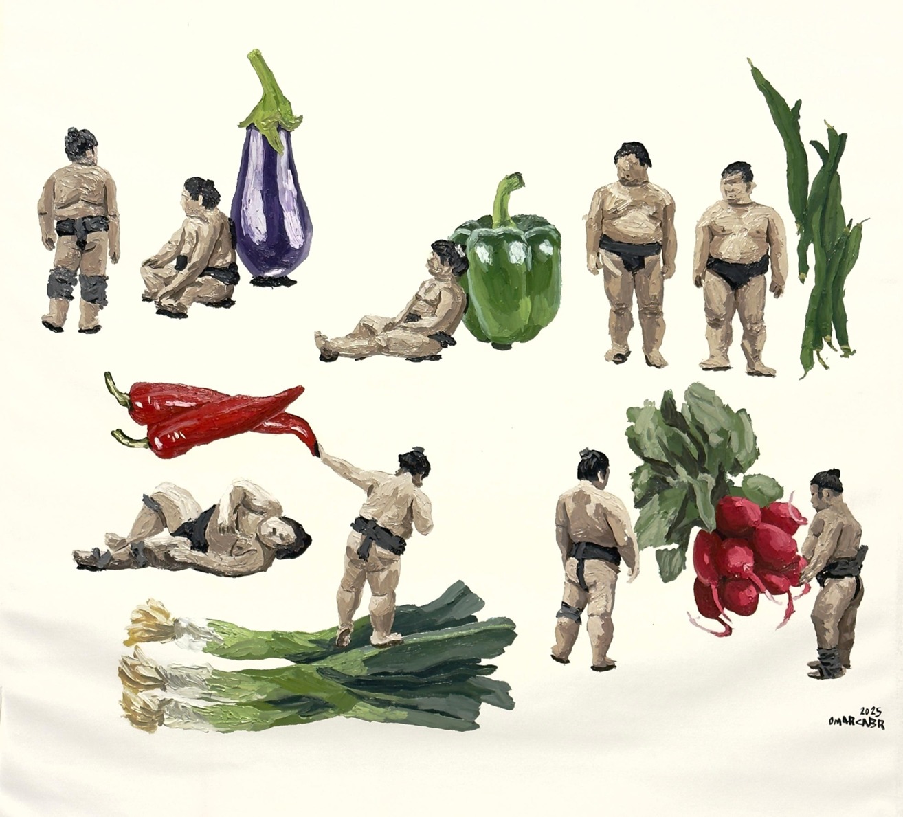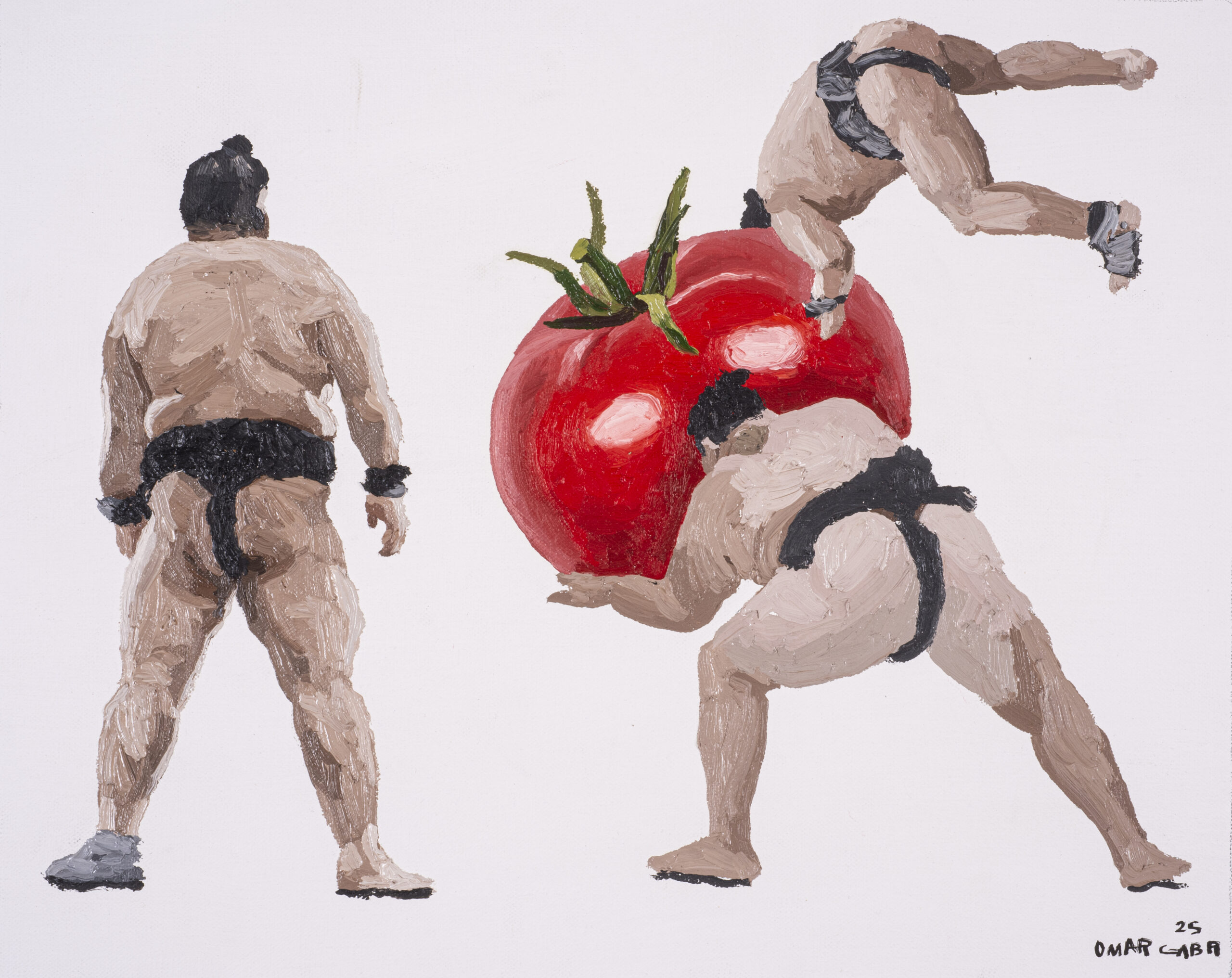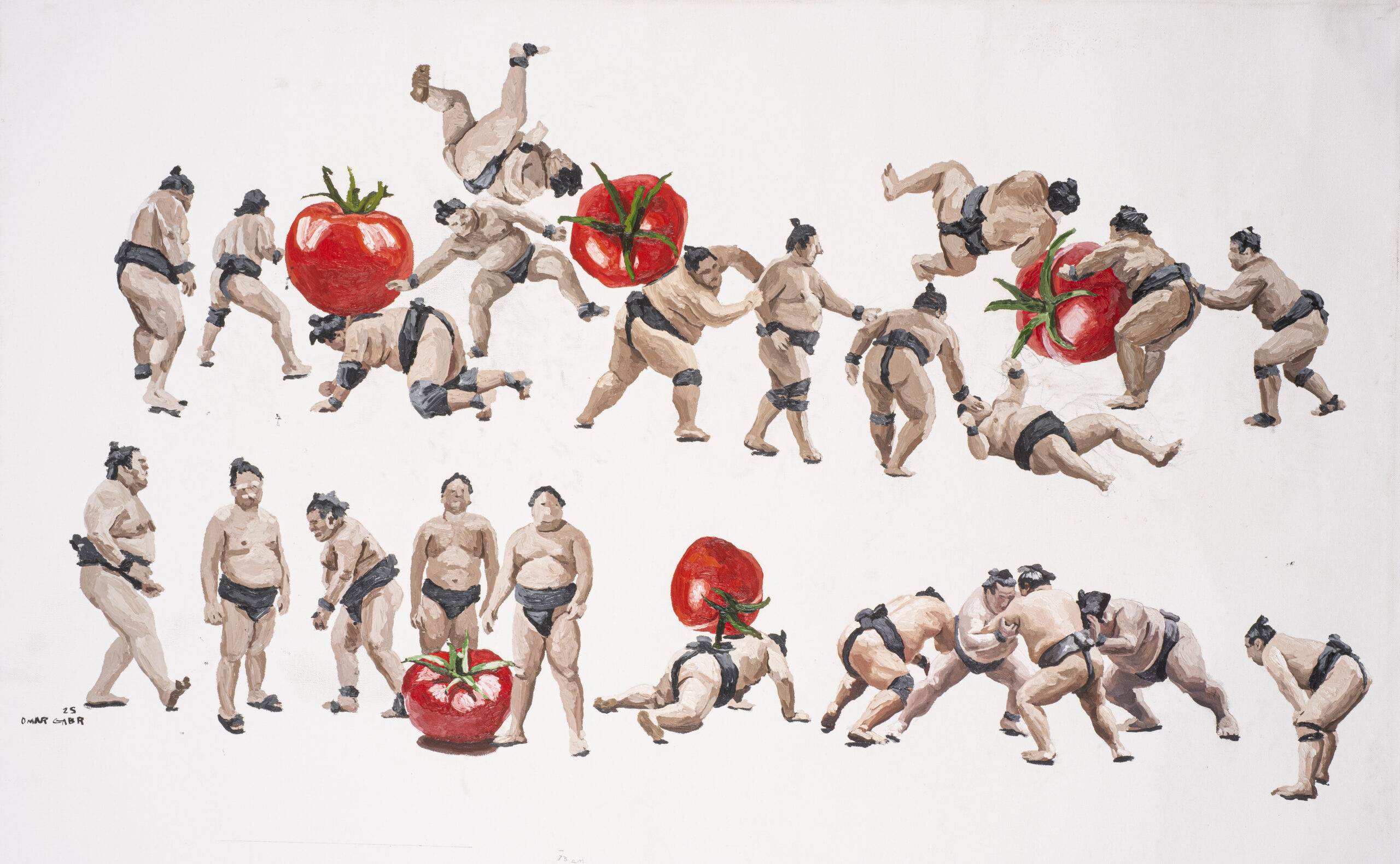 Omar Gabr is attuned to the society he grew up in and its consequences: post-revolution Egypt, the digital age of internet and social media. His figure and portrait-based work often explore personal struggles, institutional negligence as well as political and social commentary, with satire and whimsical brushstrokes. Filling canvases, papers and doors with figures, bodies, gazes, Gabr documents the everyday and the mundane in his surroundings. His gaze is attentive, playful and critical, just like his Iines.